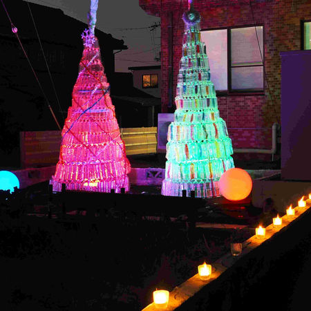 午後5時にペットボトルツリーがキラキラと輝き始めました。 2つのツリーの上には「akanoi」のイルミネーションも7色に点滅